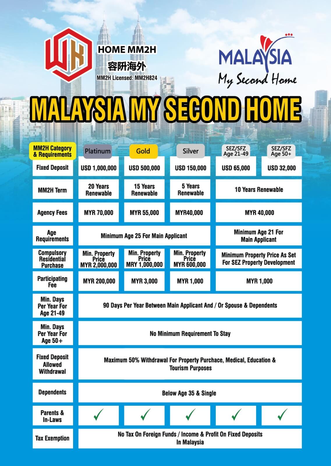 马来西亚第二家园计划 (MM2H) 开启属于您的马来西亚第二家园 我们提供一站式移民服务,从第二家园申请、房产置业到孩子入学,全程陪伴与专业指导,让您轻松开启马来西亚新生活。容阩海外,您值得信赖! 免费咨询 关于容阩海外 容阩海外(第二家园)有限公司由张容阩先生一手成立,作为马来西亚政府授权的 MM2H 签证正式代理机构。目标是为海外客户提供一站 式、全流程的马来西亚第二家园(MM2H)申请及移居服务。作为公司创办人兼核心策划人,他带领专业团队,为每一位客户量身定制方案,从签证申请到落地安家,全程无忧。自成立以来,容阩海外已成功协助数百位来自中国大陆、台湾、香港、美国、印度等国家与地区的客户顺利落户马来西亚。张先生本人更因其诚信、务实与客户至上的理念,在第二家园业界树立了良好的口碑。 他始终坚信,移居服务不仅仅是一个签证申请流程,更是对客户未来生活的全面规划。因此,他带领的团队始终以客户满意度为第一标准,力求让每一位客户都能在马来西亚开启安心、舒适的新生活。 了解更多 为什么选择我们? 马来西亚政府授权的第二家园签证代理机构 批准率高达100% 多年办理经验 成功服务超100 位客户 提供多语言服务 (中、粤、英、马) 免费初审 & 一对一顾问 秉持专业、诚信、可靠对待客户 我们的服务 置业、房地产投资 马来西亚第二家园计划 国际学校咨询 马来西亚第二家园 “马来西亚第二家园计划”(Malaysia My Second Home,简称 MM2H)是由马来西亚政府推动的长期居留计划,旨在吸引全球人士在马来西亚长期居住、投资、生活。自 2002 年起实施至今,MM2H 已吸引成千上万来自中国、日本、韩国、台湾、香港、英国等国家和地区的家庭和退休人士选择马来西亚作为他们的“第二家园”。 选择适合您的第二家园计划 铂金 (Platinum) 100万美元定存 20年签证 可工作投资 查看更多 黄金 (Gold) 50万美元定存 15年签证 可工作投资 查看更多 白银 (Silver) 15万美元定存 5 年(可续签) 可工作投资 查看更多 经济特区 (SEZ) 3.2 - 6.5万美元定存 10 年(可续签) 可工作投资 查看更多 不确定哪个组别适合您?立即免费评估! 进一步了解 8步轻松获得第二家园身份 01 咨询官方第二家园代办 02 签订服务合同 + 付定金 03 准备申请材料 04 提交申请 05 等待审批(2-3个月) 06 获批通知 07 入境马来西亚完成手续 08 领取mm2h签证 成功客户故事 案例 01 – 中国(白银组) 客户仅用 2 个月获得批文,入境当天完成贴签! MM2H 办理时间线总结: 11月5日:咨询服务并签署协议,提交初步材料11月25日:全部文件准备完成,正式提交至 MM2H 政府系统,获得回执函12月26日:获得批文1月22日:入境吉隆坡,当天完成开户、定存、体检、购保险及签证贴签1月22日:全家正式获得 MM2H 签证,合法居留马来西亚 查看详细案例 刘先生 & 家人(来自中国香港) “ 非常感谢 MM2H 项目的专业团队!从申请到获批的整个过程都非常顺利,他们耐心解答我们的问题,并提供详细的指导。现在我们已经在马来西亚安顿下来,生活环境舒适,医疗和教育资源也很优秀。真心推荐给希望拥有海外第二家园的朋友们!” 杨先生 & 家人(来自中国) “ 我们一家从最初了解 MM2H 到正式移居马来西亚,整个过程都在这家公司专业团队的协助下顺利完成。他们的服务非常细致、响应迅速,而且总是为我们考虑周到。现在孩子已经就读于国际学校,我们也适应得很好。非常感谢他们全程的陪伴与支持!” 准备开启马来西亚第二家园生活吗? 无论是申请MM2H签证,还是寻找理想的海外房产,我们的专业团队都将全程为您护航,提供一站式服务,让您的海外生活梦想轻松成真。 马上咨询,获取专属定制方案! 立即申请 微信/WhatsApp/line 在线客服,随时为您解答 微信 PwpWin Whatsapp +6019-403 9051 Line wkmm2h-win